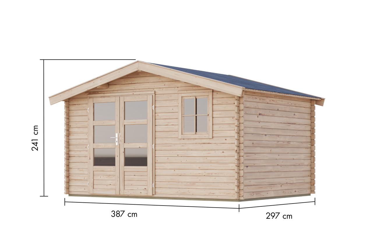 Konstruktion: 38 mm Blockbohlen, 6-Plus Eckverbindung. Dach: Satteldach aus 19 mm Massivholz Nut und Feder. (Für eine dauerhafte Lösung empfehlen wir Ihnen gegen Aufpreis unsere Dachschindeln, siehe unten). Tür: Doppelflügeltür mit 3 Lichtausschnitten aus Kunstglas und aufgesetzten Sprossen (152 x 179 cm), Zylinderschloss mit 2 Schlüsseln. Fussboden: Als Zubehör (gegen Aufpreis) erhältlich, Massivholzboden mit Nut und Feder. Unterkonstruktion: ca. 60 mm breite Bodenbalken, kesseldruckimprägniert