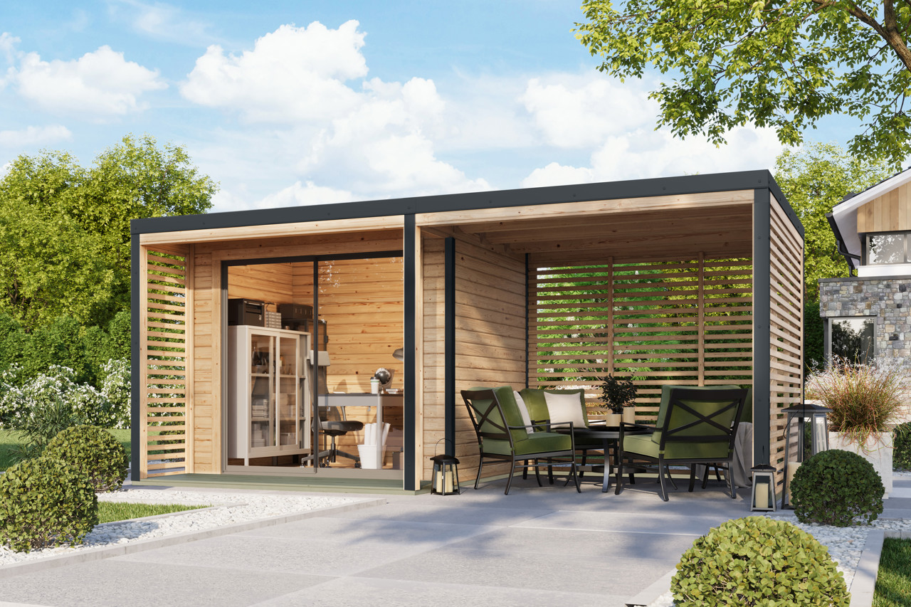 Karibu 38 mm Gartenhaus Saturn naturbelassen mit Anbaudach