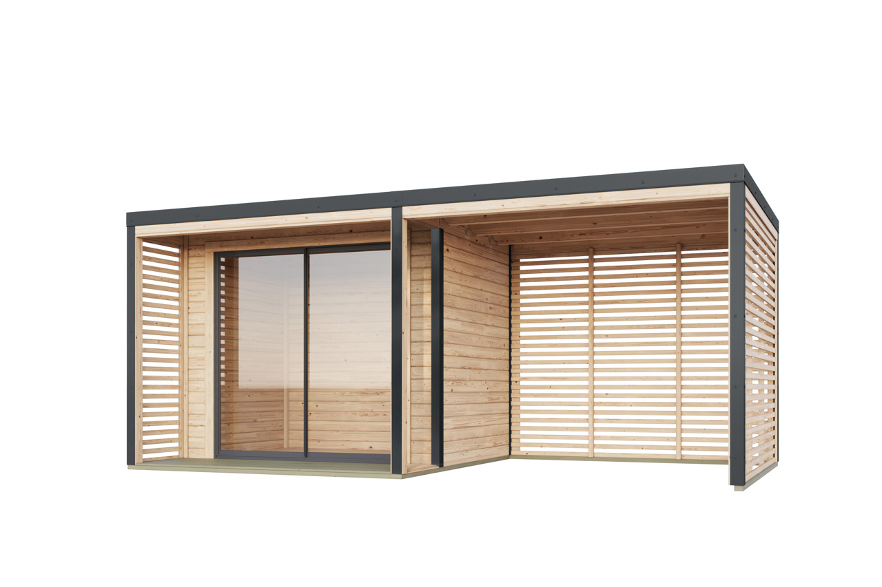 Die kesseldruckimprägniert-beplankte Terrassenfläche und die integrierten Lamellenwände schaffen einen harmonischen, geschützten Außenbereich. Ebenfalls im Lieferumfang enthalten sind kesseldruckimprägnierte Unterleger sowie ein hochwertiger Massivholzboden.