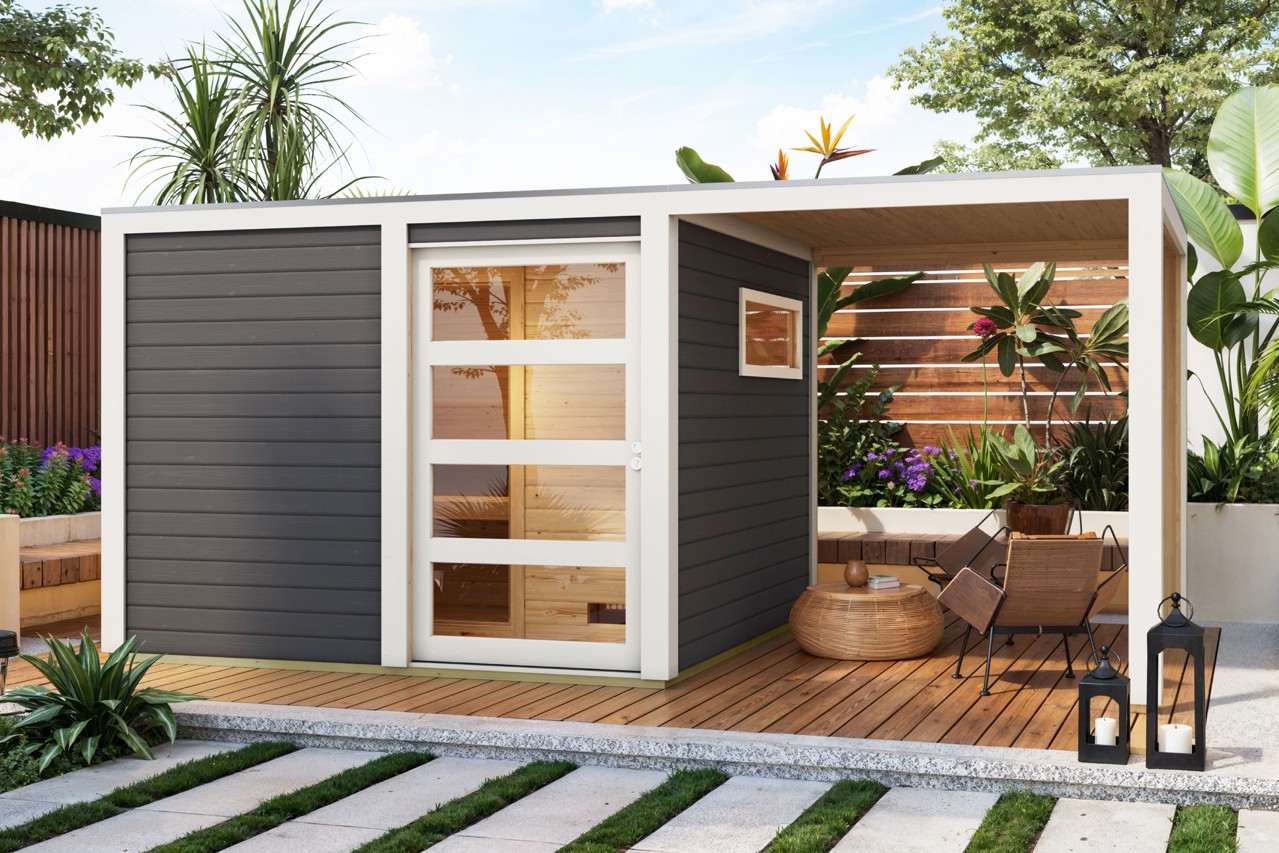 Abb. oben: Saunahaus Cuben in terragrau mit Schiebetür aus Klarglas und Zubehör (gegen Aufpreis) Anbaudach
