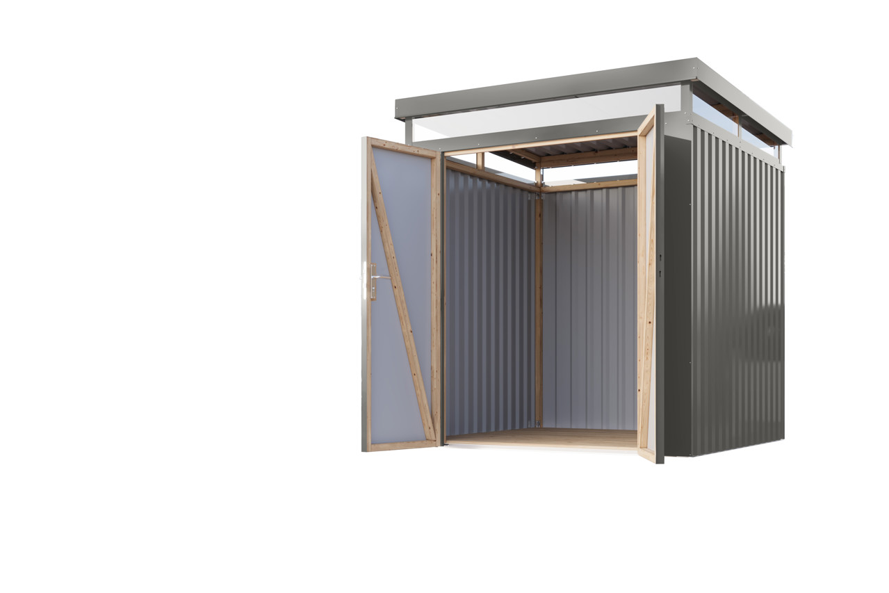 Die Wände bestehen aus hochwertigem, polyesterbeschichtetem Trapezblech. Dieses Material verleiht dem Metallhaus nicht nur eine elegante Optik, sondern bietet auch zuverlässigen Schutz vor Witterungseinflüssen und garantiert eine lange Lebensdauer.