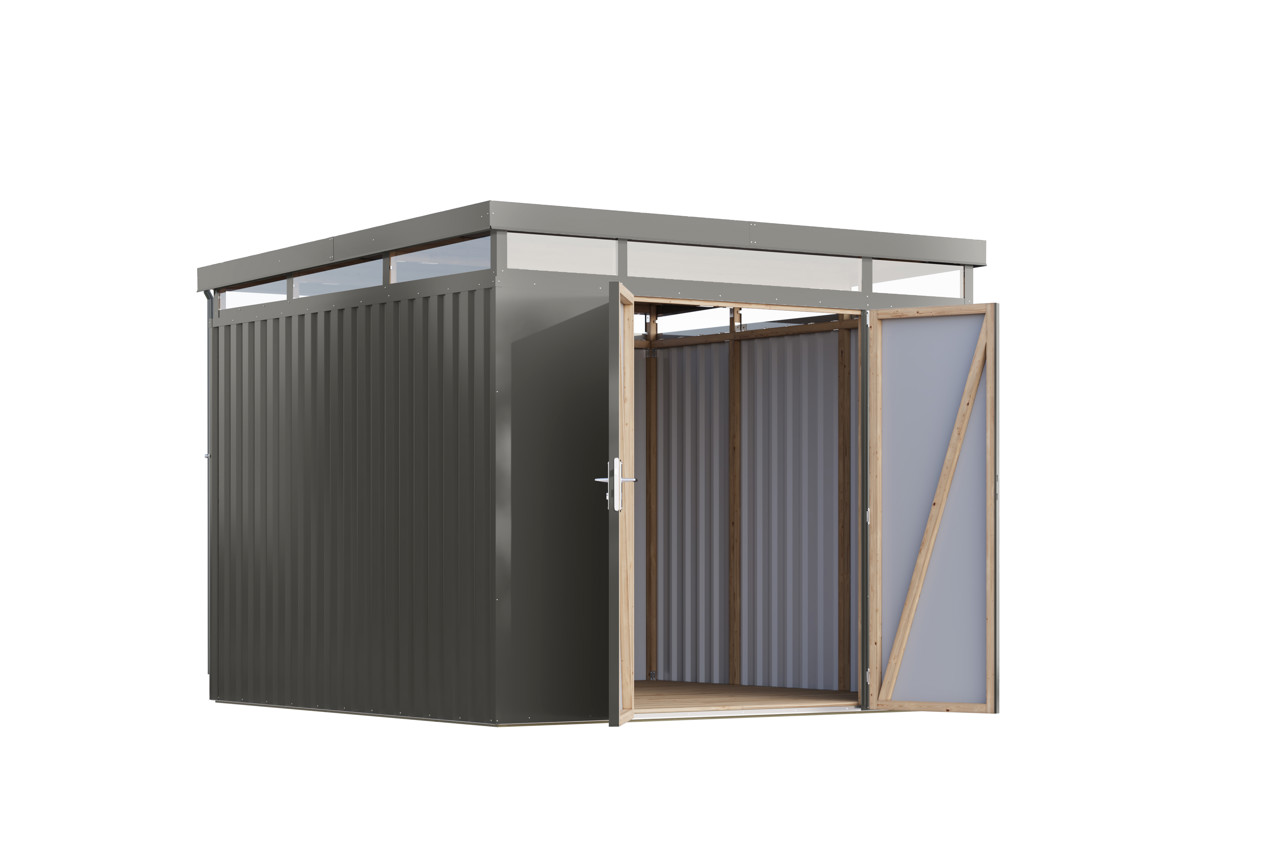 Die Wände bestehen aus hochwertigem, polyesterbeschichtetem Trapezblech. Dieses Material verleiht dem Metallhaus nicht nur eine elegante Optik, sondern bietet auch zuverlässigen Schutz vor Witterungseinflüssen und garantiert eine lange Lebensdauer.