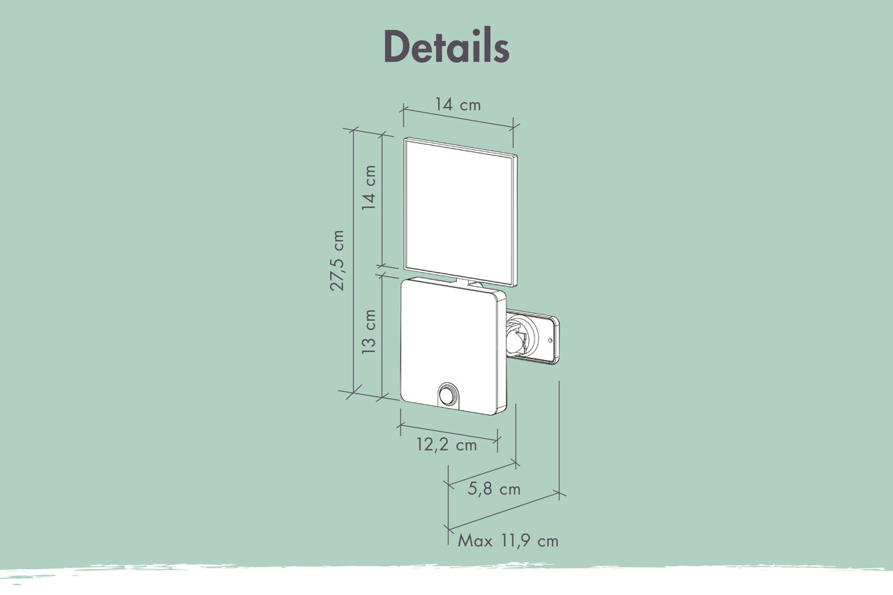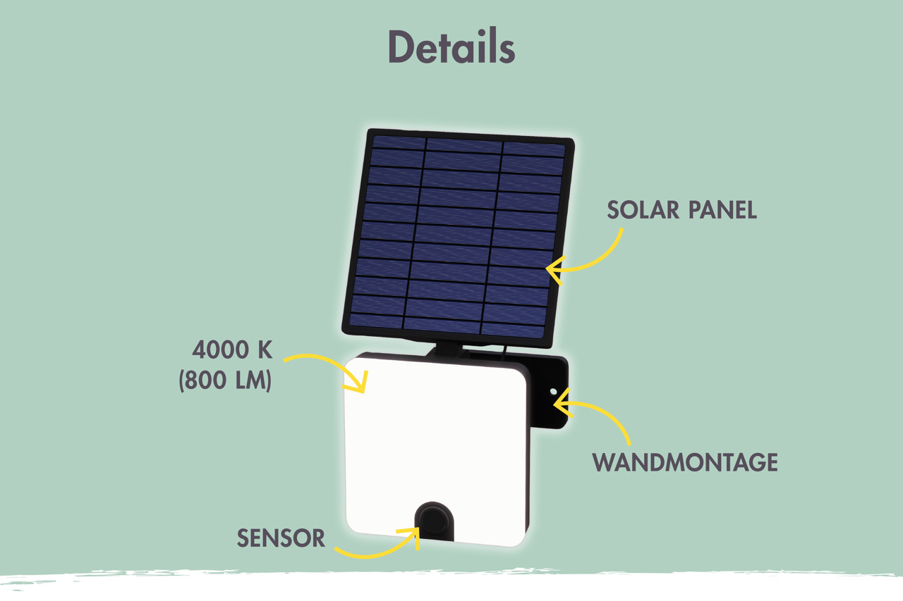 Autarker Betrieb durch Solarpanel und Akku (2000 mAh) Sicherungsklasse: IP44, für den Außenbereich geeignet Details: - inkl. Bewegungsmelder - 800 Lumen hell (12Watt) - IP44 Spritzwasser geschütztes Gehäuse aus Aluminium & Glas