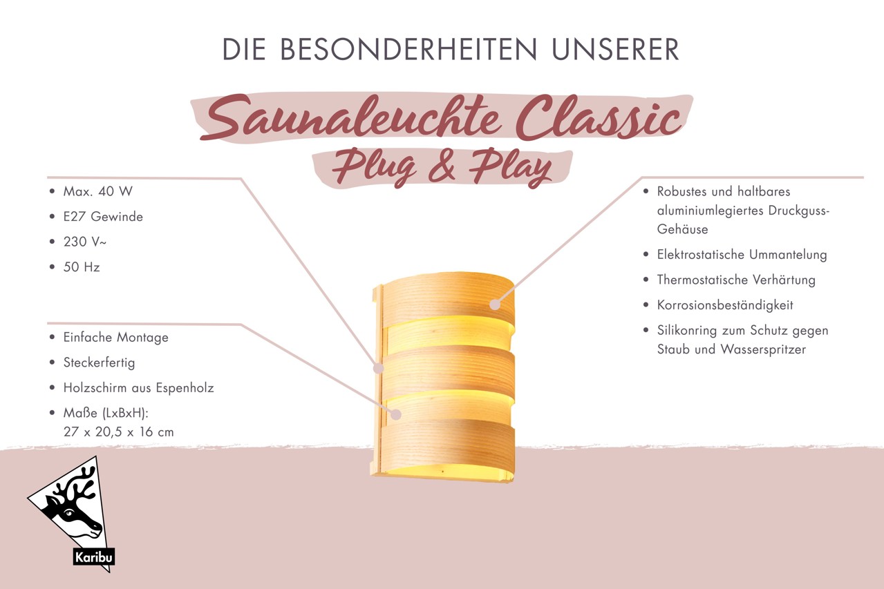 steckerfertige Plug & Play Saunaleuchte Classic für 230 Volt betriebene Saunen (inkl. Kabel, wird an der P & P Steuerung angeschlossen)