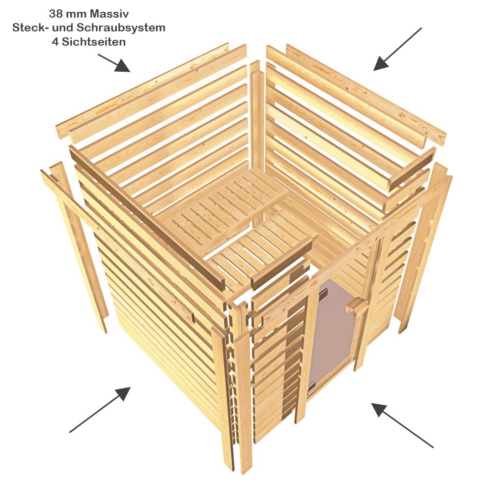 Die KARIBU Woodgarden 38 mm Massivholzsaunen bestehen aus einzelne Holzbohlen, und werden durch ein einfaches Steck- und Schraubsystem zusammen gebaut. Diese Bauweise entspricht dem finnischen Vorbild und ist die ursprüngliche Art, eine Sauna zu bauen. Viele Sauna-Anhänger schwören auf diese traditionelle Bauweise. Deshalb sollten Sie Ihren Geschmack entscheiden lassen - und in dieser Hinsicht haben unsere Massivholzsaunen einiges zu bieten. Lieferumfang: inkl. extrabreite Ganzglastür, 2 stabile Liegen und ein Ofenschutzgitter. Optional mit oder ohne Dachkranz.